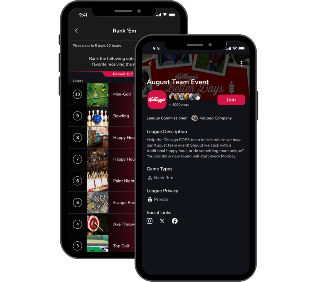 Games can be used to gather valuable insight on important topics like benefits & company perception, help inform decisions about event scheduling or logistical details like ‘where should our next happy hour be’ or provide a fun, interactive way to build company culture.