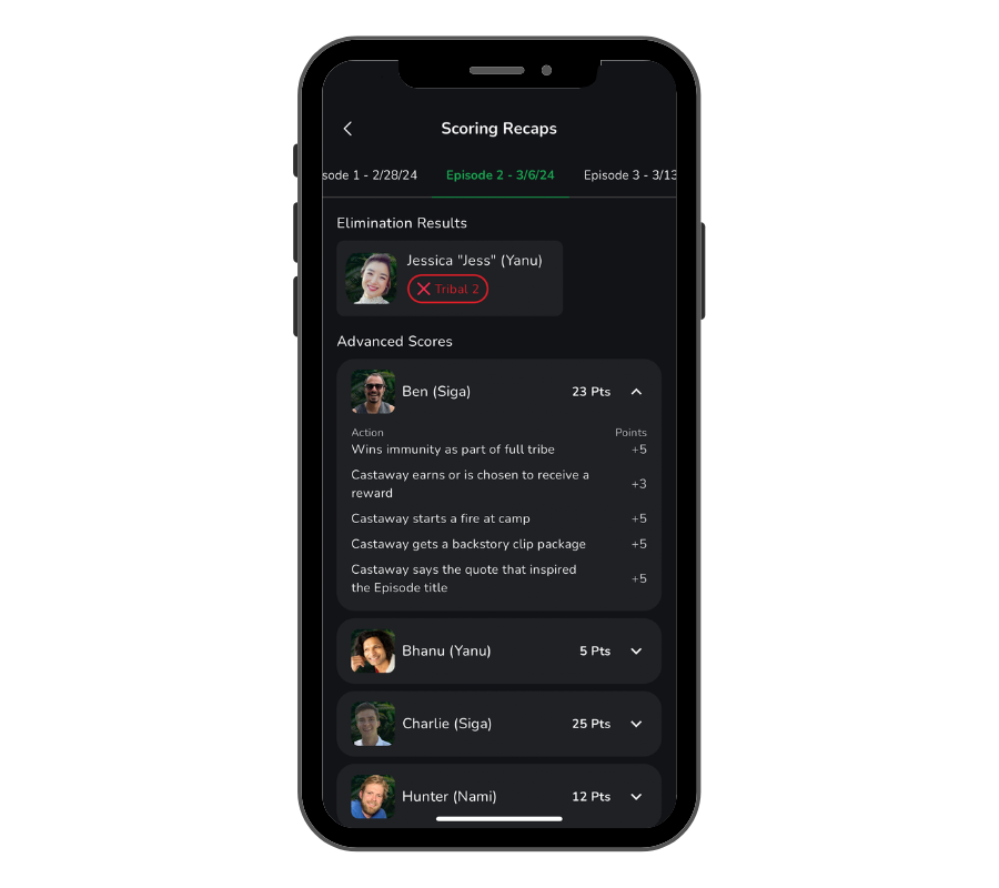 Ben (+1): -5 First to get eliminated during an individual immunity challenge, -2 Each vote cast against castaway at Tribal (post-merge), +3 Castaway is seen swimming or fishing (not including challenges), +5 Castaway says the quote that inspired the Episode title